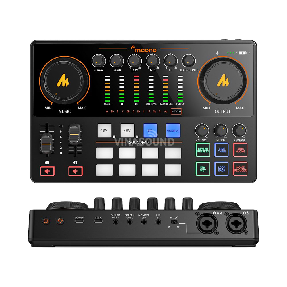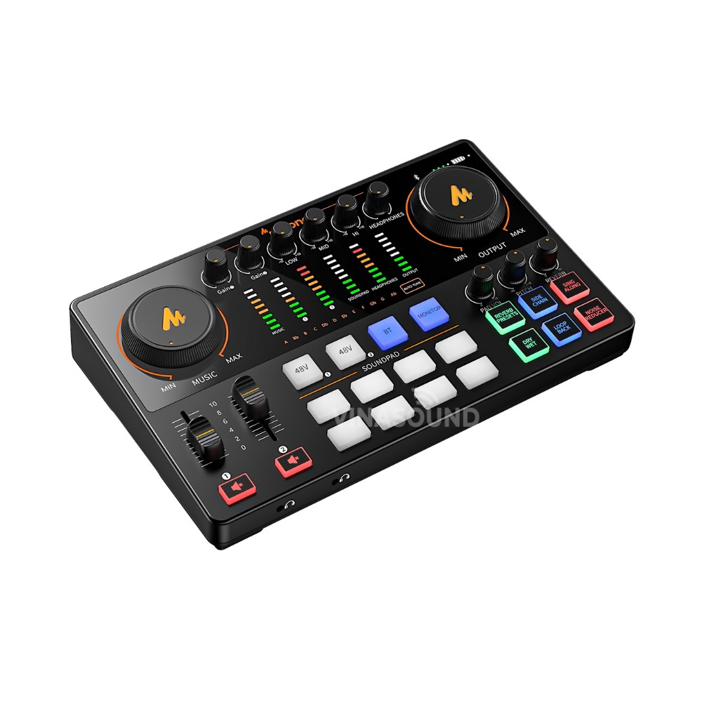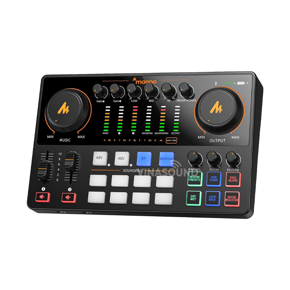 Maono AME2 là bộ trộn âm thanh chuyên nghiệp cho livestream và podcast, tích hợp preamp +60dB cùng 48V phantom power, dùng tốt cho mic dynamic và condenser. Hệ thống fader đa nhiệm, 6 preset reverb, auto-tune, side chain auto-ducking, dry/wet, denoise 2-stage và loopback giúp kiểm soát âm thanh linh hoạt. Trang bị 11 sound pads tùy chỉnh, pin 2.000mAh dùng đến 8 giờ, hỗ trợ phát sóng đa thiết bị linh hoạt.